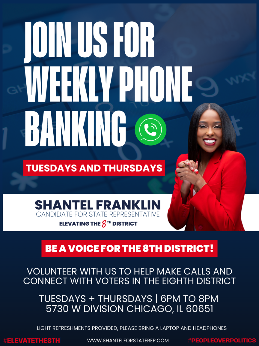 Phone banking brings volunteers together to connect directly with voters across the 8th District and help move this campaign forward. This is a key opportunity to have real conversations, share Shantel Franklin’s vision, and make sure community voices are heard.